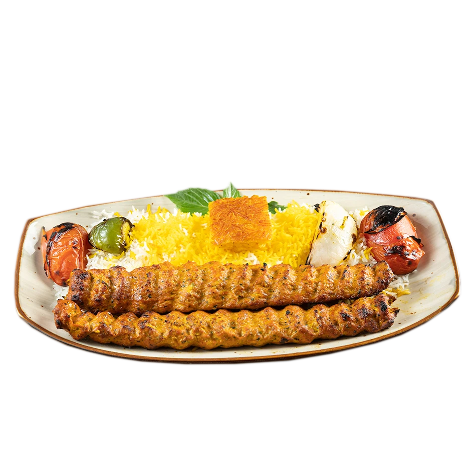beef tenderloin and skewer of ground beef served saffron basmati rice.