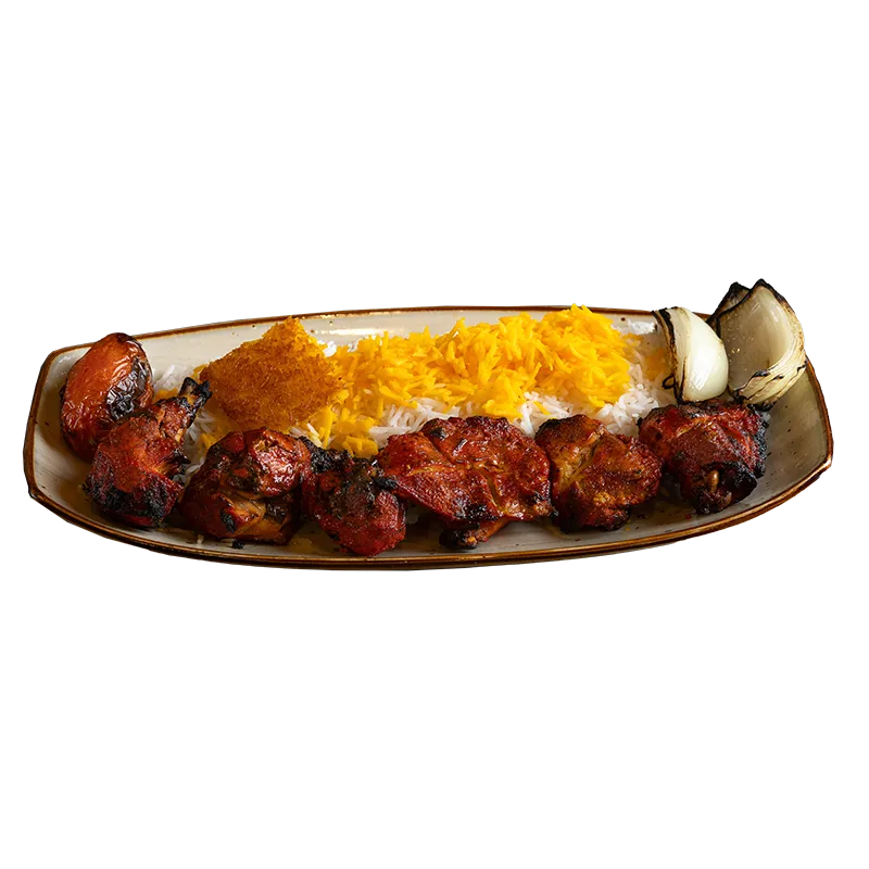 Serves 10 persons. A combination of 4 skewers of beef, 4 skewers of chicken koobideh, 3 skewer chicken barg, 2 skewer beef barg, and 4 pieces of lamb chop serve with your choose of rice, bread and an appetizer plate.