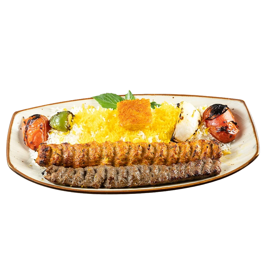 A skewer of beef fillet and chicken barg served with grilled tomato, bell pepper, onion and imported basmati rice mixed with cranberry topped with saffron and tabbouleh.