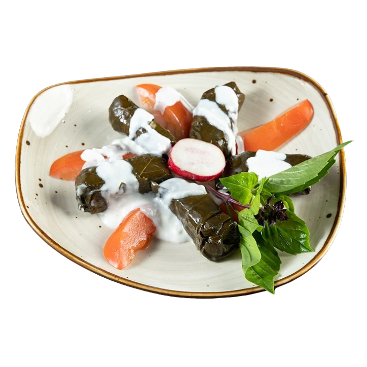 Five cooked grape leaves, filled with rice, herb and olive oil.