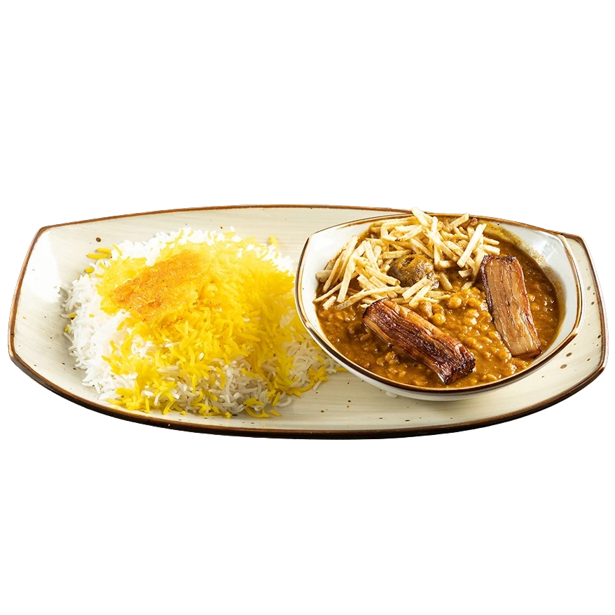 beef stew, yellow split peas, eggplant served with saffron basmati rice.