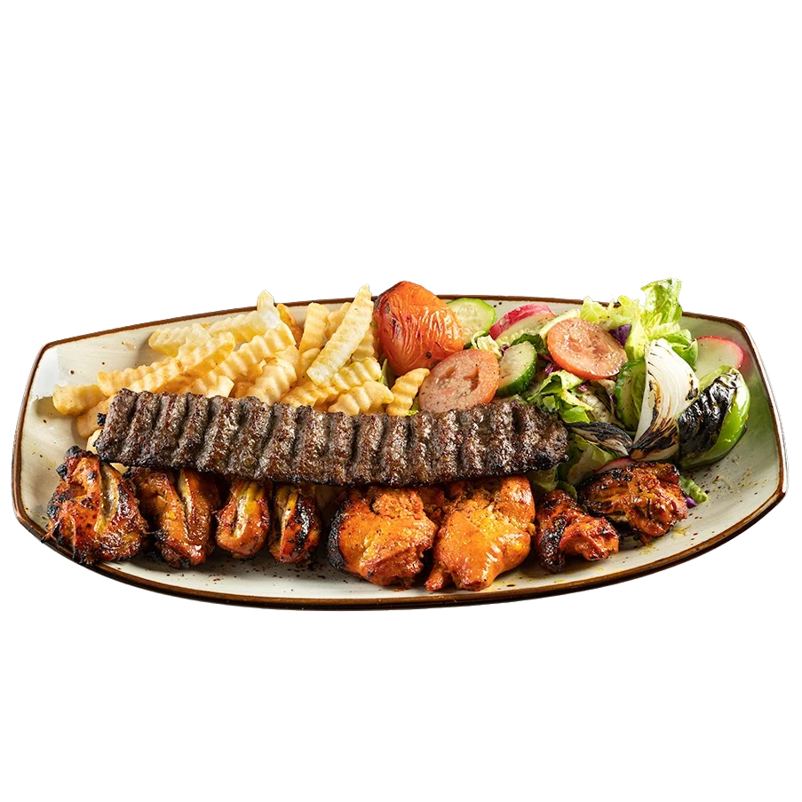 Serves 6 persons. A combination of 2 skewers of beef, 2 skewers of chicken Koobideh, 2 skewer chicken barg 2 skewer beef barg and 4 pieces of lamb chop served with your choose of rice, bread and appetizer plate.