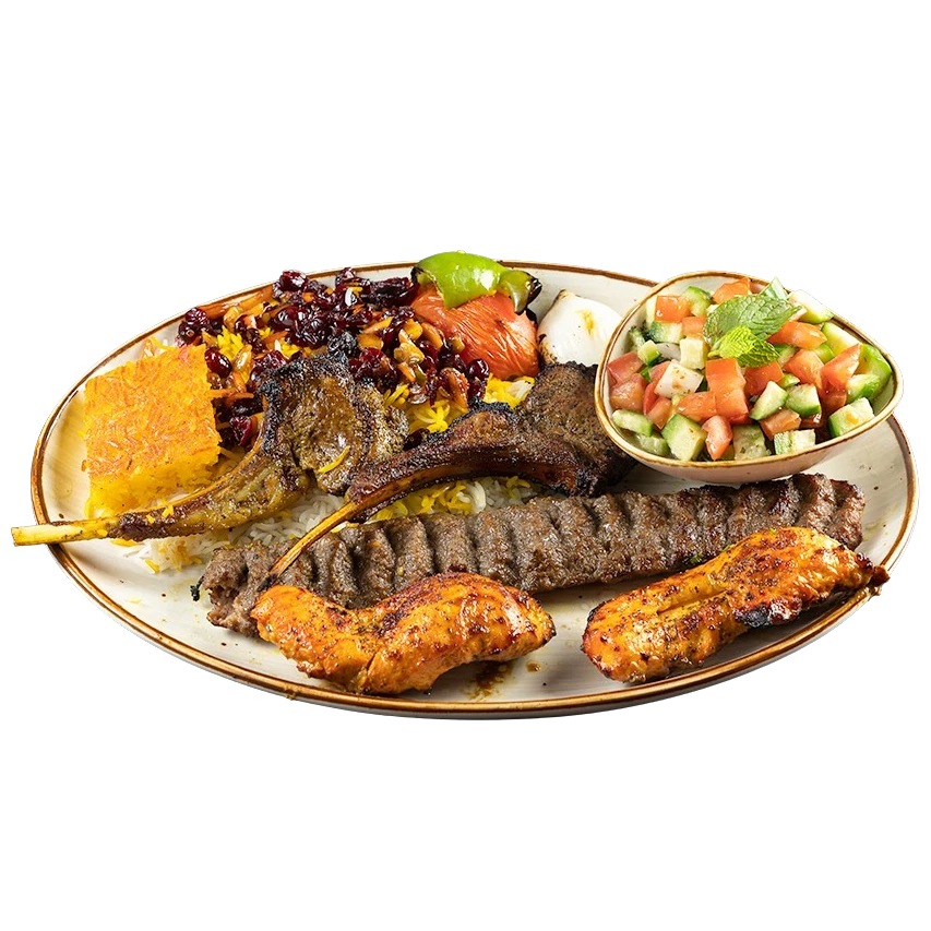 A skewer of ground beef, 2 pieces of chicken tender kabab and 2 pieces of lamb chops served with grilled tomatoes, bell pepper, onion and imported basmati rice mixed with cranberry topped with saffron and Persian salad.