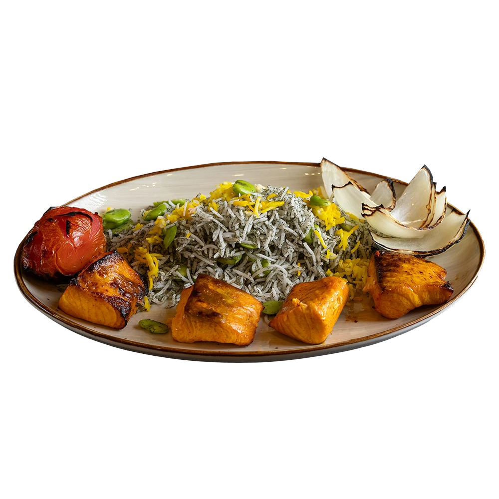 Grilled of marinated chunk of tilapia served with grilled tomato, bell pepper, onion and imported basmati rice mixed with dill and lima beans topped with saffron and steam vegetable.