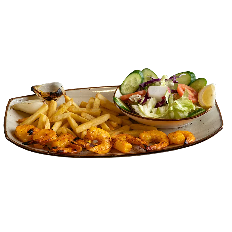 jumbo shrimp served with French fries and house salad.